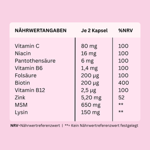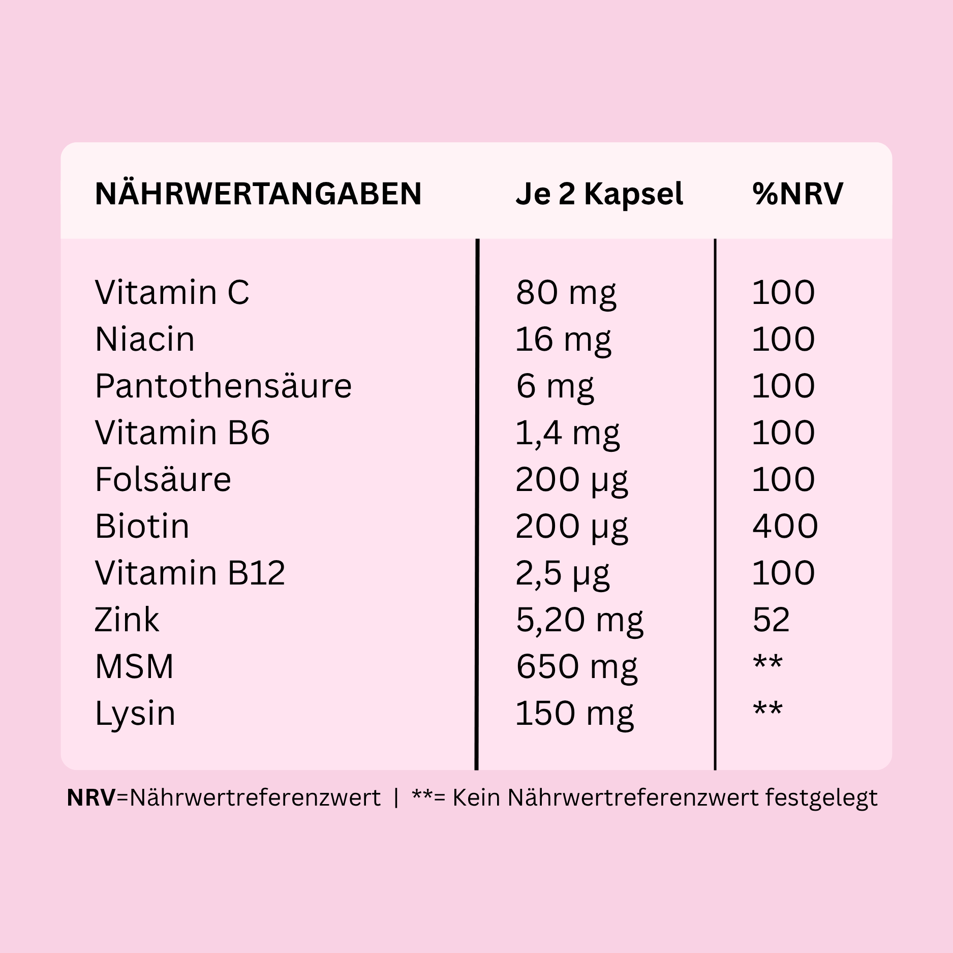 Unsere fachmännisch formulierte Mischung von Inhaltsstoffen umfasst Biotin, B12, Folsäure, Zink, L-Lysin, MSM, Niacin, B5, B6, Vitamin C und Kokosnusswasser.
